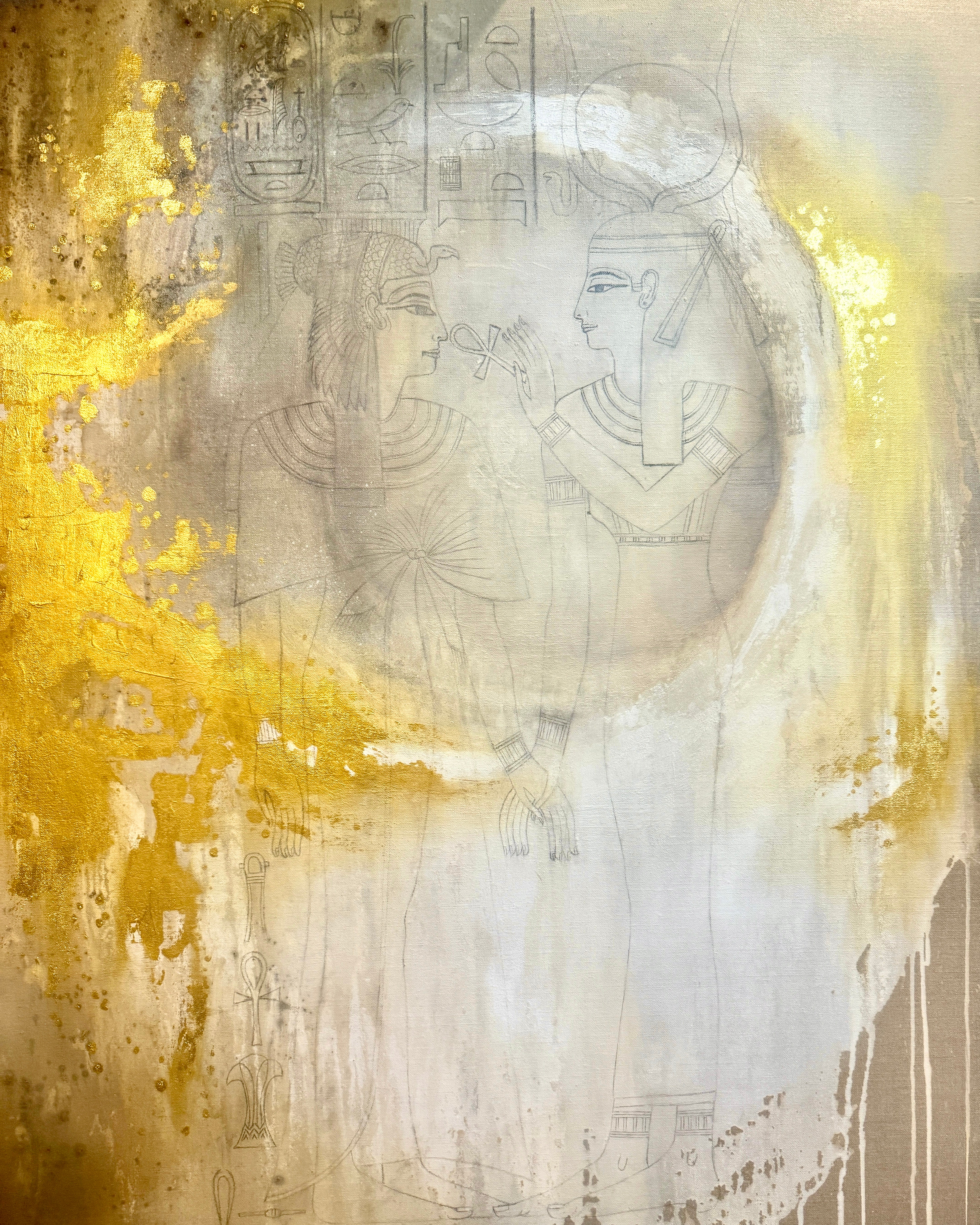 𓂀 This piece is a living invocation, a meeting of worlds—past and present, earthly and celestial. Inspired by the timeless beauty of ancient art, I’ve woven together layers of texture, 24k gold, with natural elements that hold the memory of the land itself, crushed lapis Lazuli & Malachite, - the image of Hathor offering the ankh to Queen Nefertari emerges—timeless, powerful, and full of grace.