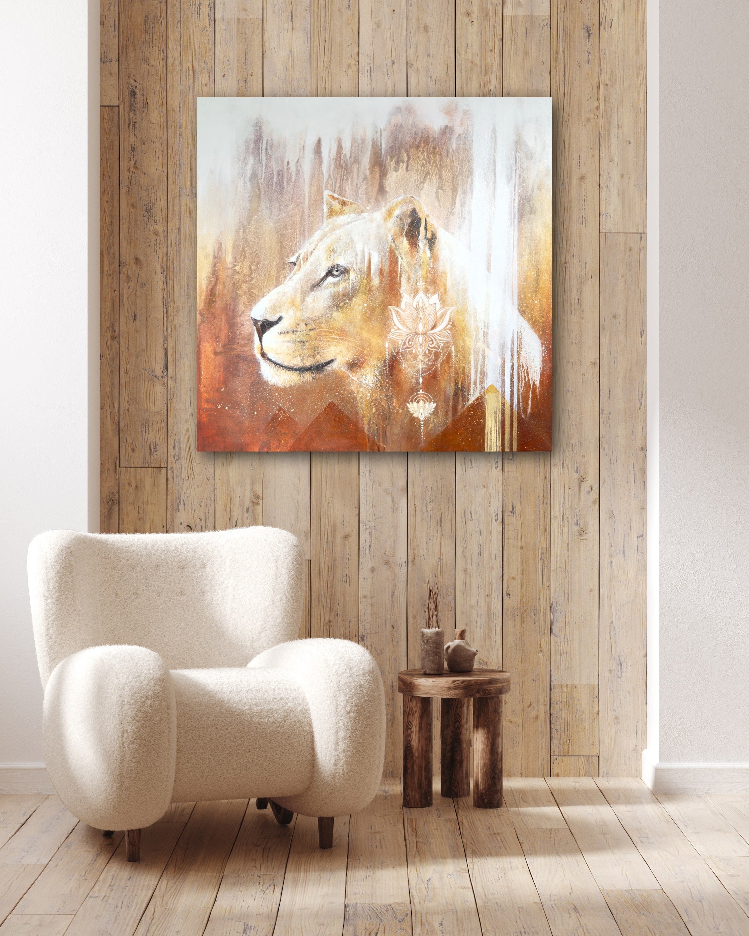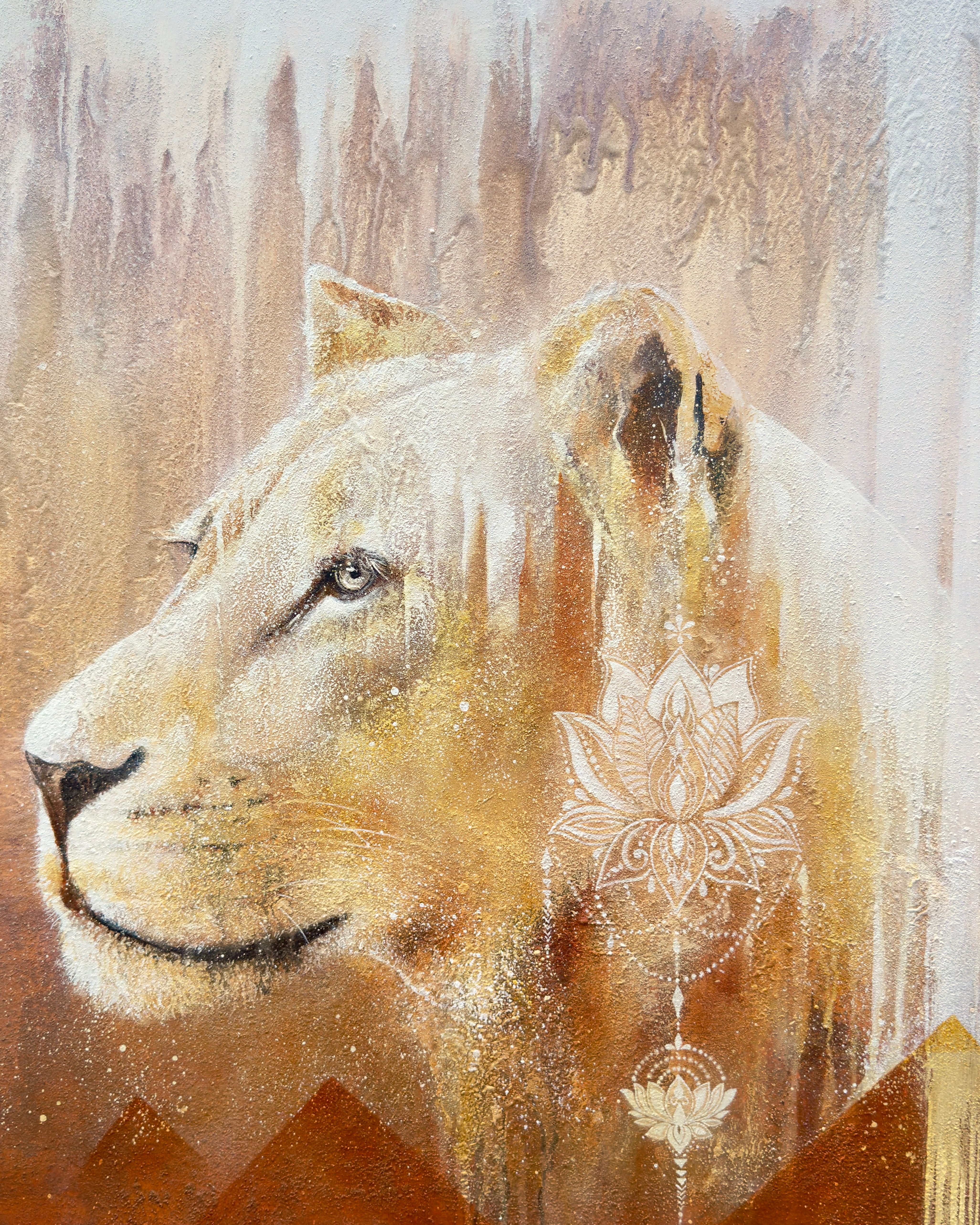 In the white lion's gaze, the spirit of Sekhmet shines through, fiercely loving and compassionate. The ethereal background, with its subtle hints of a world in balance, evokes the memories of Zep Tepi, the "First Time," when Sekhmet walked with strength and grace among the Gods and Goddesses, imparting her wisdom and courage to all. This painting, then, is more than a visual tribute; it is an invocation of her spirit, calling forth the harmony and Love of this time.