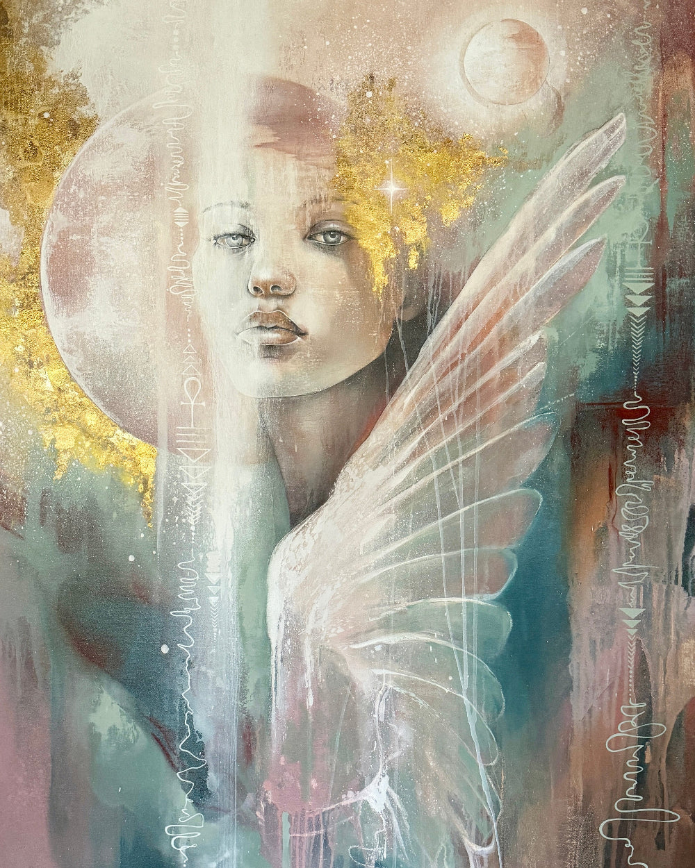 "She embodies the quiet strength of the universe, where divine light meets the stars and stone of this great cosmos. In her gaze, we find the reflection of our own infinite potential."